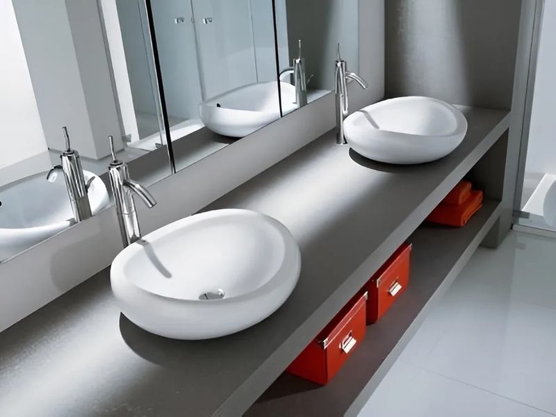 Forma redonda sin orificios. Tipo de instalación sobre encimera, con posición central. Ideal para baños modernos que buscan estilo y funcionalidad.