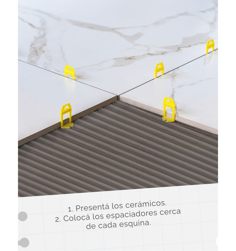 Información adicional: Se colocan con adaptador para cuñas, logrando una separación pareja entre uniones. Este paquete de 150 unidades es ideal para evitar desniveles durante el fraguado.