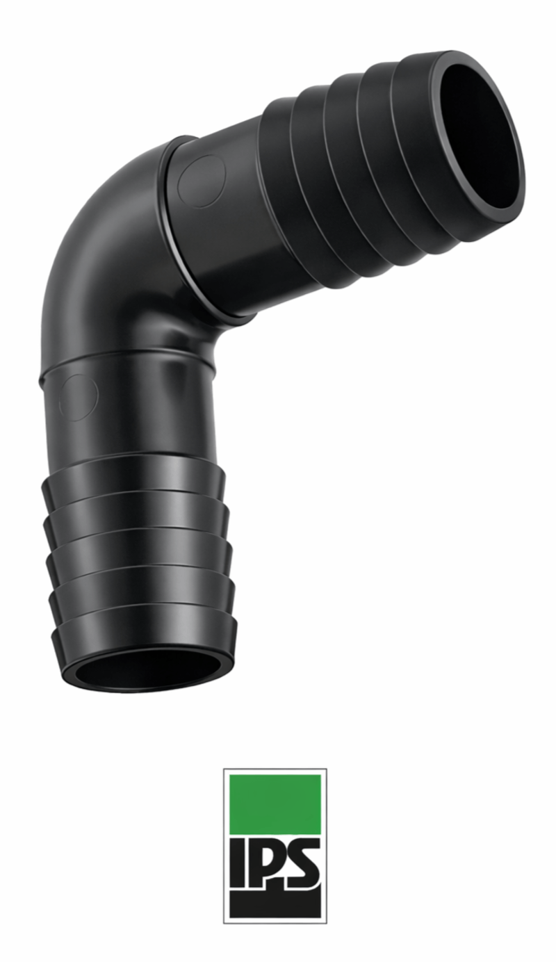 Conector tipo espiga doble en formato codo de 90°, marca IPS. Diseñado para unir mangueras o caños flexibles en esquinas o zonas de difícil acceso, permitiendo cambios de dirección sin comprometer la conexión. Fabricado en plástico resistente.