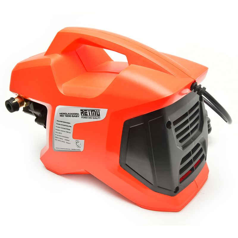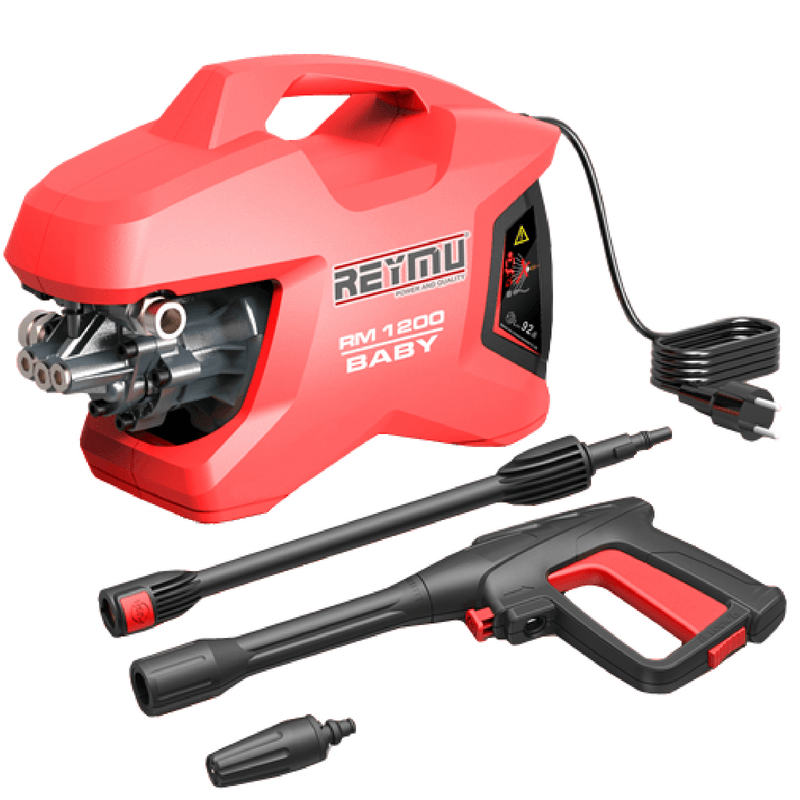 Hidrolavadora Reymu RM1200 Baby de diseño compacto y robusto, ideal para tareas de limpieza exigentes en el hogar, vehículos y superficies exteriores. Su potencia de 1400W y presión de 70 Bar ofrecen un rendimiento eficiente y práctico.