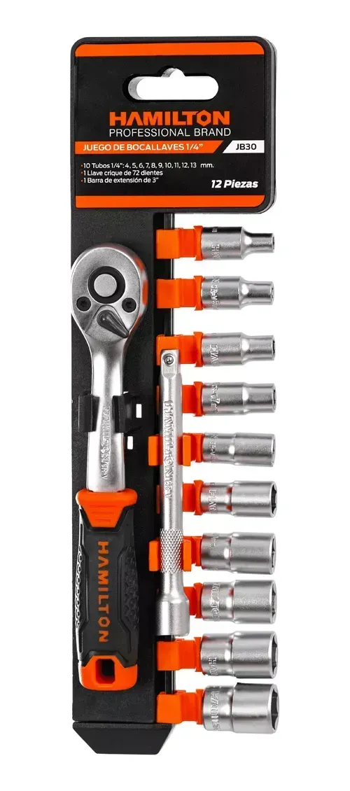 El Juego de Bocallaves Encastre 1/4" 12 Piezas Hamilton es una herramienta compacta y versátil, diseñada para trabajos de precisión en mecánica, automoción y mantenimiento en general. Su encastre de 1/4" permite realizar ajustes de menor torque con gran precisión, ideal para espacios reducidos y componentes delicados. Fabricado en acero cromo vanadio, garantiza durabilidad, resistencia al desgaste y protección contra la corrosión. Su acabado cromado facilita la limpieza y prolonga la vida útil del producto. Incluye un trinquete reversible de 72 dientes, lo que proporciona ajustes suaves y precisos en cualquier posición. Además, el set viene en un soporte organizador, asegurando un almacenamiento práctico y transporte eficiente.