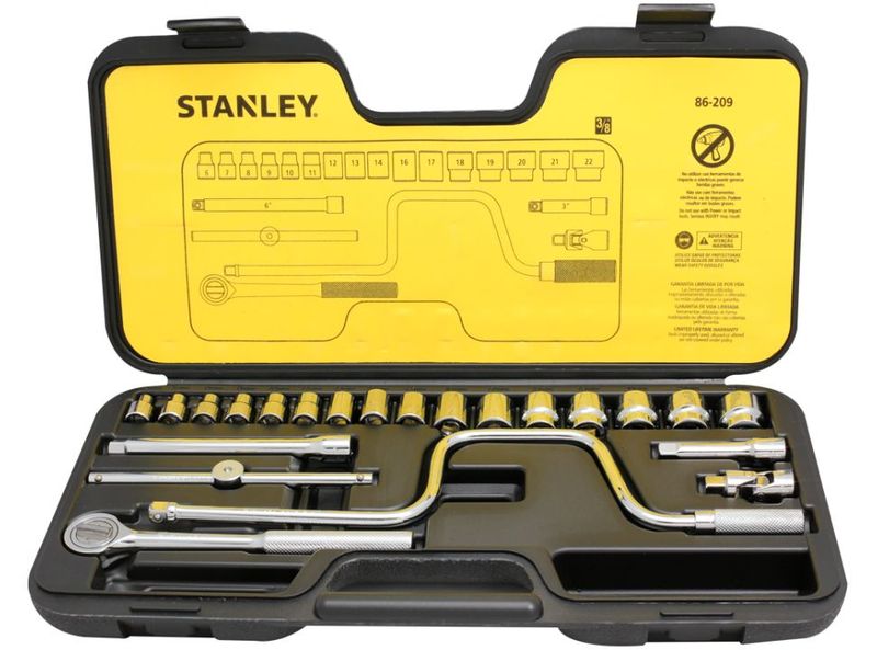 El Juego de Bocallaves Stanley de 23 piezas, modelo 86-209, con encastre de 3/8", está diseñado para brindar precisión y eficiencia en tareas mecánicas, automotrices e industriales. Fabricado en acero cromo vanadio y con acabado cromado, ofrece alta resistencia, durabilidad y protección contra la corrosión. Su criquet de 72 dientes permite un ajuste suave en espacios reducidos. Incluye un práctico estuche organizador para un almacenamiento y transporte seguros.