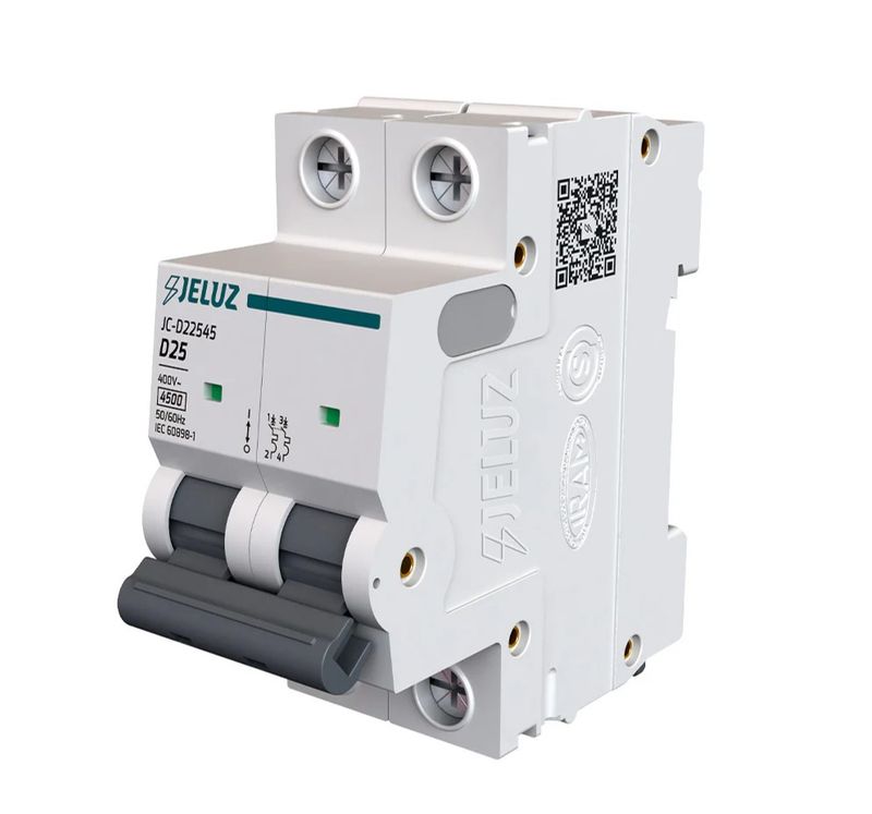 Interruptores termomagnéticos bipolares Jeluz, curva C y poder de corte 4,5 kA. Ideales para protección de circuitos en instalaciones residenciales y comerciales, brindando seguridad, confiabilidad y fácil montaje en riel DIN.