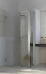 Mampara frontal con panel fijo y apertura, fabricada a medida con vidrio templado y herrajes de acero inoxidable, combinando diseño moderno, funcionalidad y seguridad para tu baño.