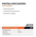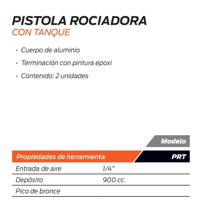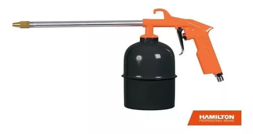 Pistola rociadora metálica con tanque, ideal para aplicaciones de limpieza y pulverización en talleres, industrias o uso general. Fabricada en aluminio con terminación en pintura epoxi para mayor durabilidad.