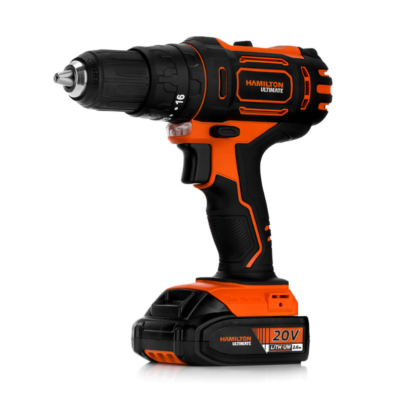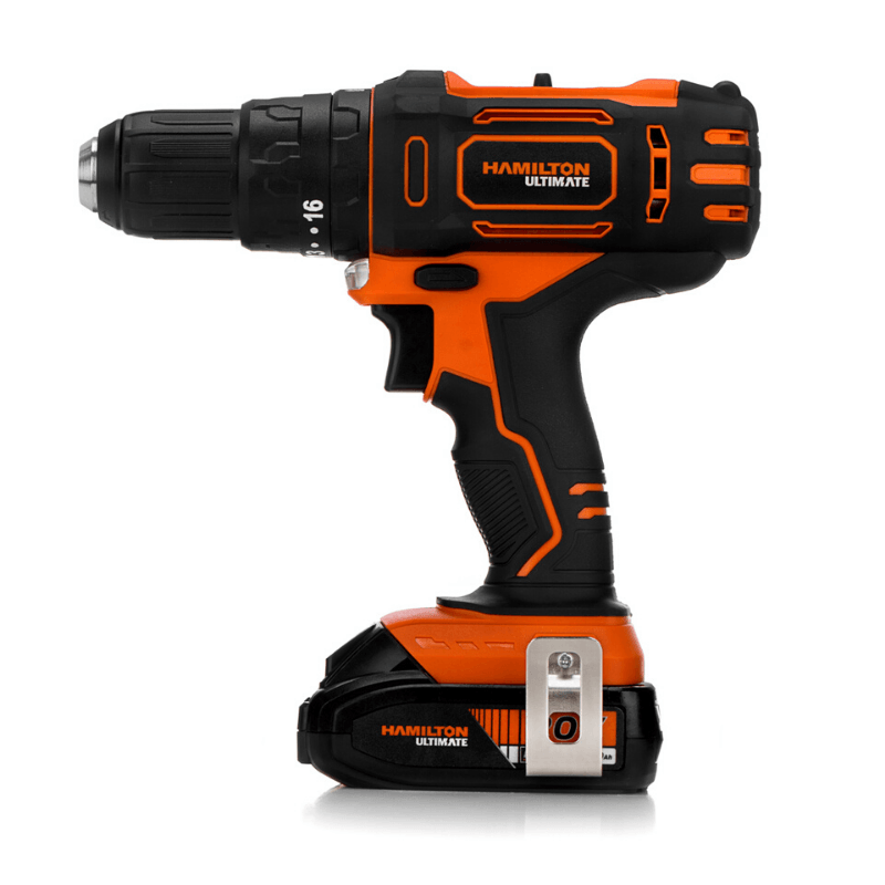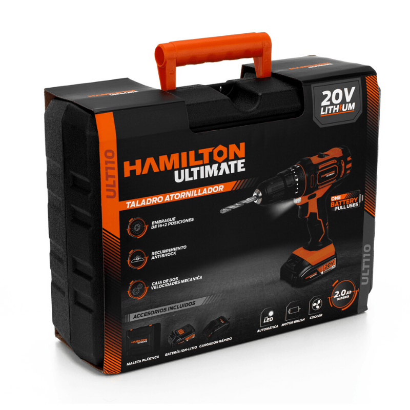 El taladro atornillador inalámbrico Hamilton Ultimate de 20V está diseñado para tareas de perforación y atornillado con precisión y eficiencia. Cuenta con embrague de 16 + 2 posiciones, motor brushed y caja mecánica de dos velocidades. Su diseño con recubrimiento antishock garantiza un agarre cómodo, ideal para trabajos continuos tanto profesionales como de bricolaje.
