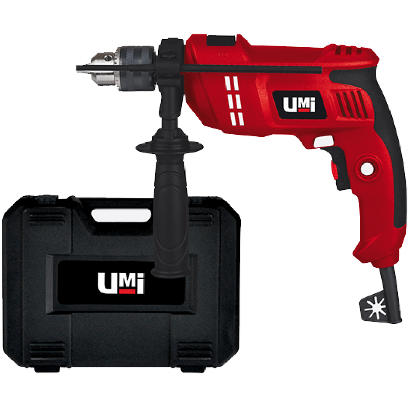 El taladro percutor Umi HU022 ofrece un rendimiento confiable con velocidad variable y botón de bloqueo para trabajos continuos. Su función de percusión y perforado sin impacto lo hace versátil para múltiples aplicaciones. Incluye limitador de profundidad y práctico maletín de transporte.