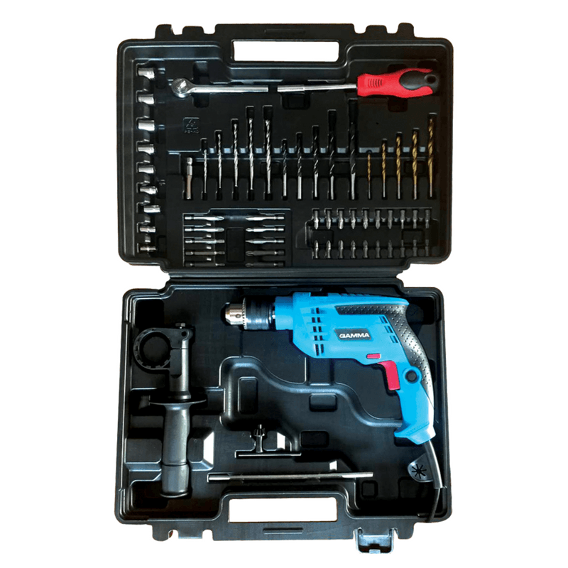 El taladro percutor G1903KAR de Gamma posee gatillo centralizado de comando y selector de reversa. Empuñadura lateral ergonómica y una práctica valija con accesorios. El mandril autoajustable asegura un firme acople de la mecha. Con selector de percusión práctico y funcional llave para su activación. Este taladro es ideal para perforar, taladrar, percutir diferentes materiales.