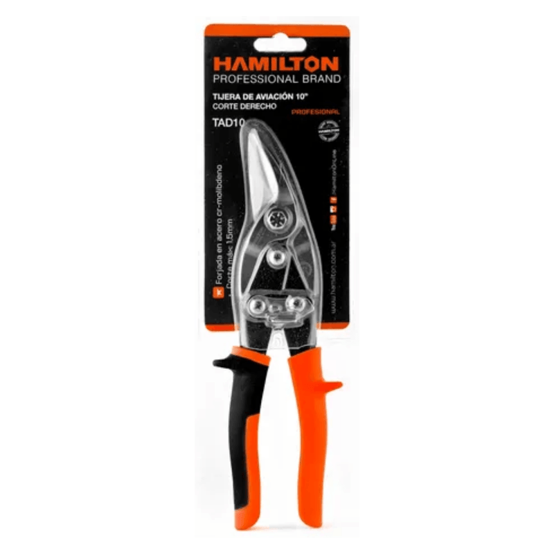 Descripción: La tijera Hamilton TAD10 está diseñada para cortar chapa de hasta calibre 18. Sus mordazas afiladas y dentadas permiten un corte preciso y eficiente. Con mango bimaterial y ergonómico, ofrece un agarre cómodo y seguro, reduciendo la fatiga durante su uso prolongado. Ideal para trabajos que requieren precisión en el corte de chapas metálicas.